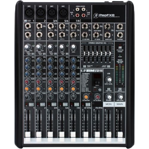 Professionnal compact mixer with USB I/O 8 channels Onboard effects 4 low-noise, high-headroom Mackie mic preamps with easy LED metering 32-bit RMFXTM processor with 16 "Gig-Ready" reverbs, choruses and delays Precision 7-band graphic EQ for tuning Mains or Monitors USB I/O for recording shows and music playback via Mac or PC 3 full stereo channels plus extra stereo return for keyboards, external effects or stereo playback devices 60mm faders for input channels, returns and Main/Monitor masters 3-band active EQ (80Hz, 2.5kHz and 12kHz) on all channels Hi-Z input for direct connection of guitar, bass and other instruments Insert, 100Hz low cut filter, and 48V phantom power on all mic channels Stereo RCA tape I/O with input level control Headphone output with separate rotary level control Balanced XLR and balanced/unbalanced 1/4-inch Main outputs FX mute with remote control via footswitch Break switch mutes all channels for music playback between sets Built-like-a-tank steel chassis with rugged, yet stylish ABS sidecheeks Planet Earth switching power supply for worldwide use Includes Tracktion 3 Music Production Software for Mac or PC