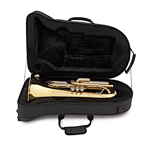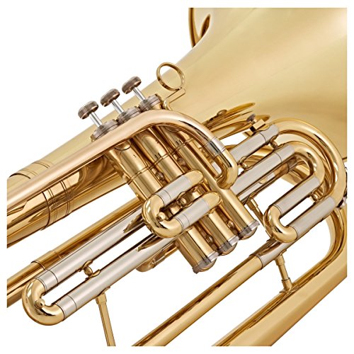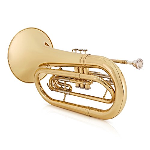 The marching Bb baritone horn by Gear4music is an ideal instrument for the marching band. Featuring a horizontal playing position the sound projects straight forward and towards the audience perfect for outdoor playing. The three valve non-compensating system makes it lightweight for maximum comfort.